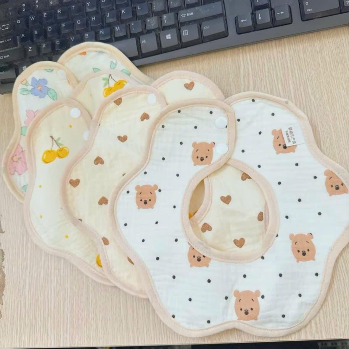 Yếm muslin mềm mịn, thấm hút tốt; set 5 cái có cúc bấm điều chỉnh.